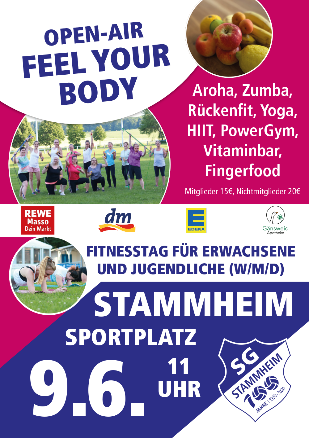 Link zur Veranstaltung und zum Flyer -> OPEN-AIR FEEL YOU BODY FITNESSTAG FÜR ERWACHSENE UND JUGENDLICHE (W/M/D) Aroha, Zumba, Rückenfit, Yoga, HIIT, PowerGym, Vitaminbar, FingerfoodMitglieder 15€, Nichtmitglieder 20€